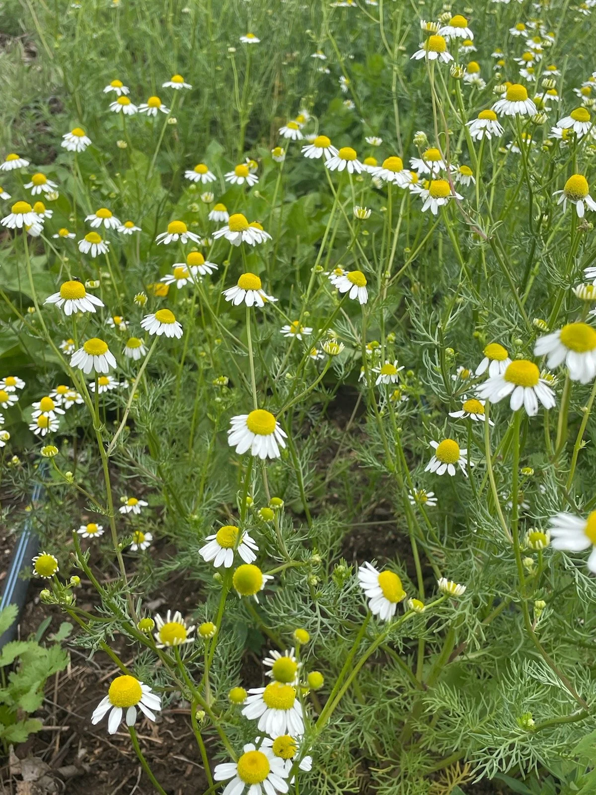 Pictured: German Chamomile (Matricaria recutita) dancing in our trial plots.